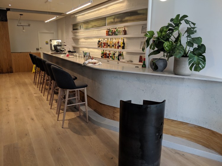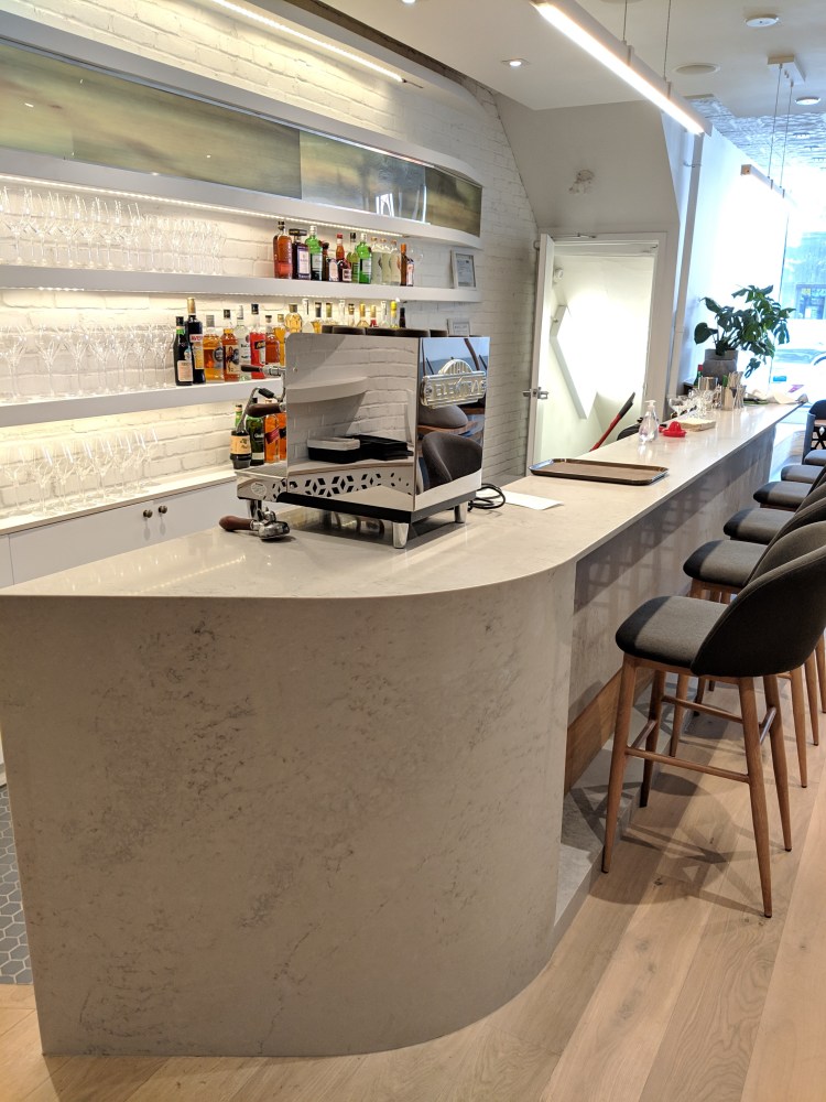 a custom metal podium in front of the curved quartz and white oak bar.