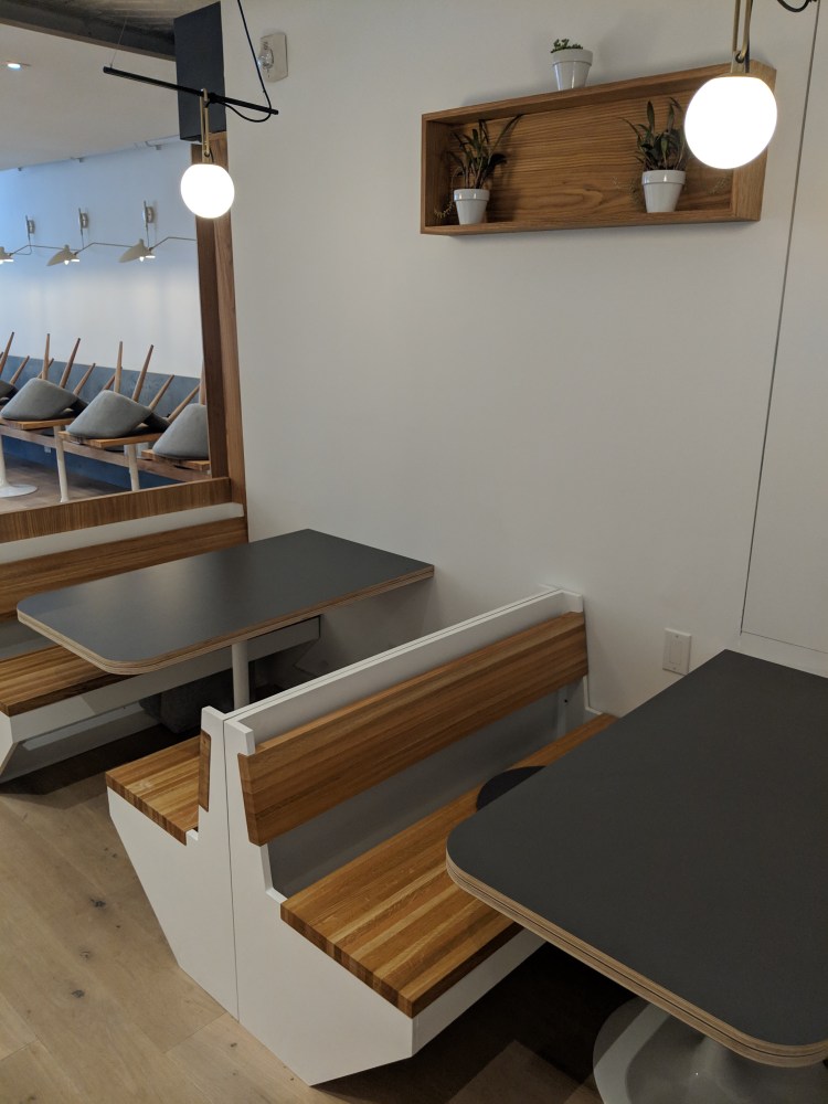 floating white oak bench and white oak tables all custom made