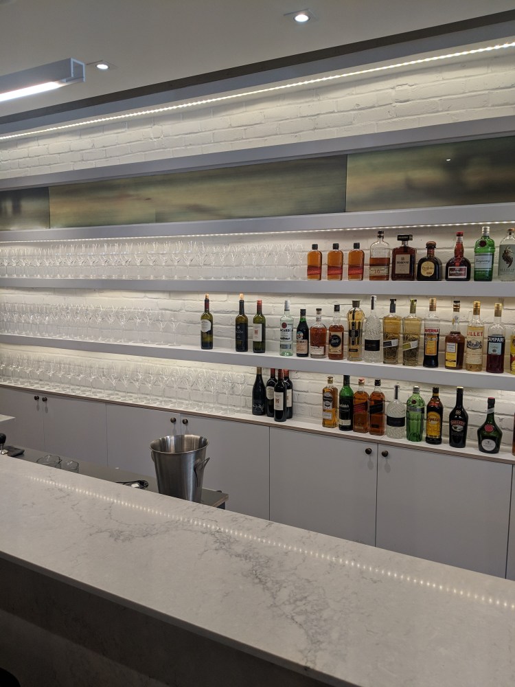 curved underlit bar shelving with a backlit mural