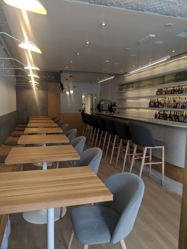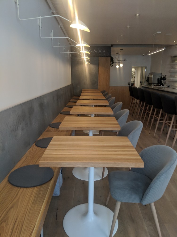 white oak floors. white oak tables and Caesar stone quartz we the major design elements